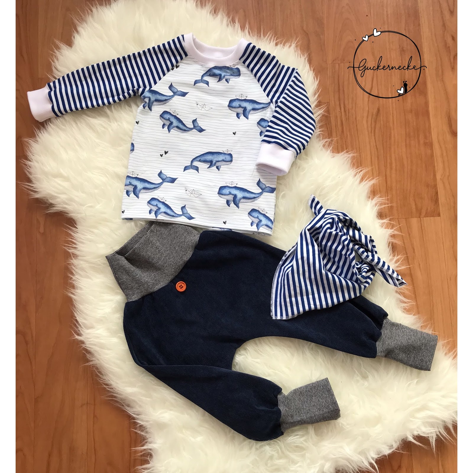 Dieser wundervolle Wal - Jersey ist einer von den besagten Motiv - Stoffen, die ich für unseren kleinen Wirbelwind bei Alles für Selbermacher gekauft habe. Den blaugestreiften sowie den senfgelben Jersey habe ich auch schon vor einigen Jahren bei Lillestoff gekauft.